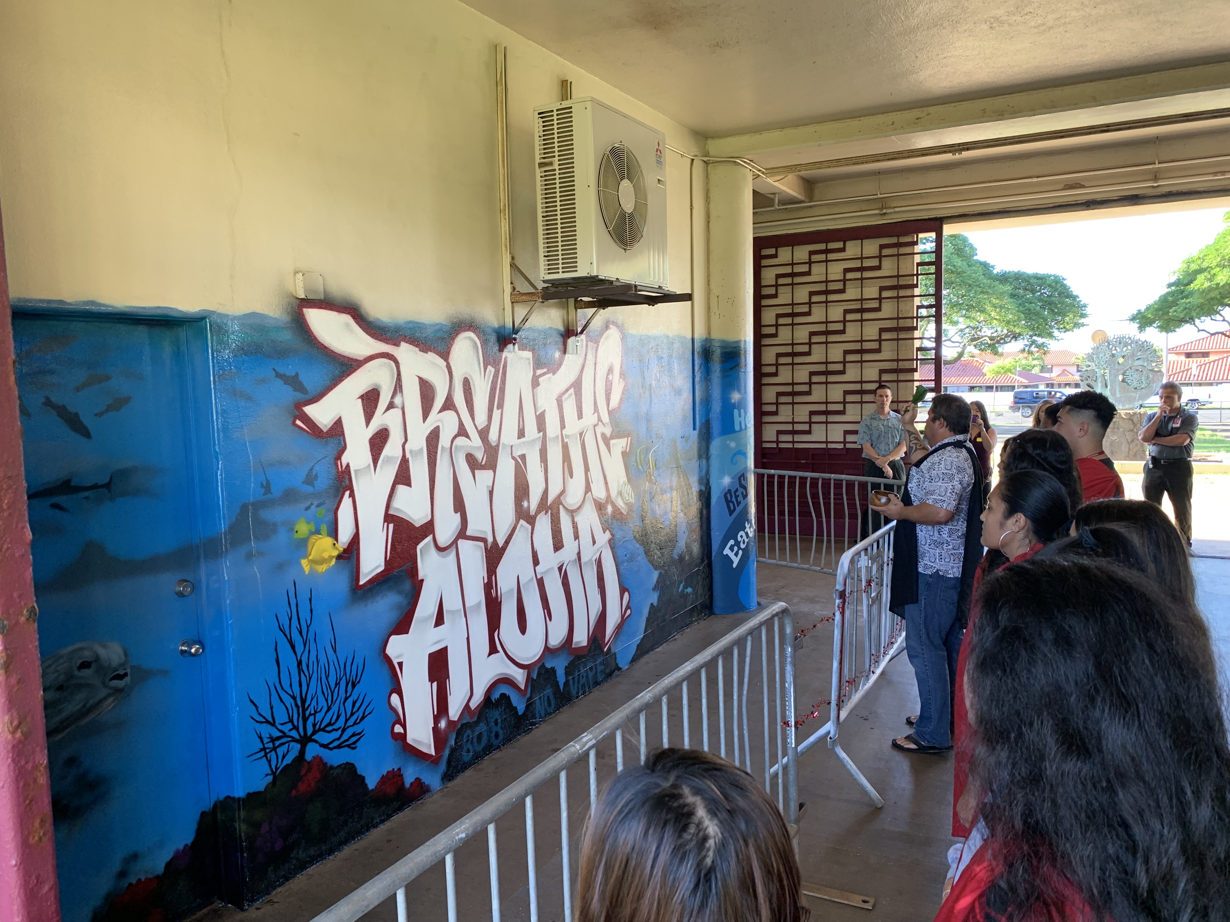 On Monday the unveiling was coupled with a vaping prevention presentation by Kevin Ramirez. The mural blessing by Kumu ‘iliahi Doo & his Hawaiian studies class was much appreciated; thank you! Mahalo to Representative Dennis Arakaki for presenting the Certificate of Appreciation & also to Lisa Joy Andres for the mural footage.